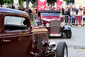 Фестиваль "Мотостолица-2025" на Манежной площади в Санкт-Петербурге. Шоу моторов, состоящее из 100-метровых парных заездов ретро автомобилей.