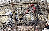 Фестиваль "Мотостолица-2025" на Манежной площади в Санкт-Петербурге. Участники команды каскадеров на мотоциклах во время показательных выступлений в "Шаре смелости".