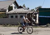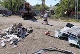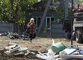 Последствия ночного обстрела в Ленинском районе Донецка. Погибла одна женщина. Разрушенный жилой дом после обстрела. Ремонтная служба с подъемной люлькой восстанавливает поврежденную электросеть.