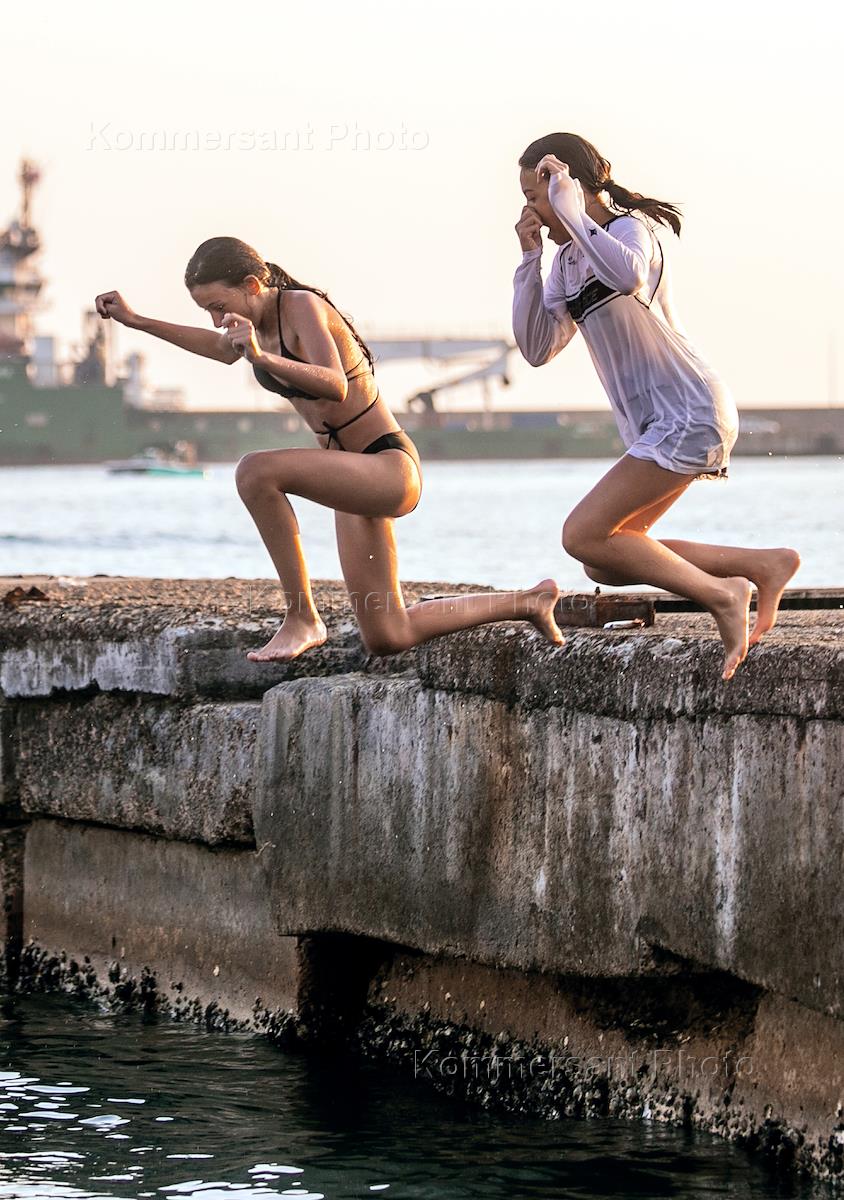 Жанровая фотография. Отдыхающие на берегу Черного моря. Дети прыгают с пирса в море.