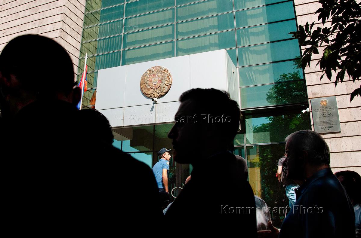 Судебное заседание по делу архиепископа Баграта Галстаняна, обвиняемого в попытке захвата власти, в Уголовном суде первой инстанции общей юрисдикции города Еревана. Жанровая фотография. Ситуации у здания суда.