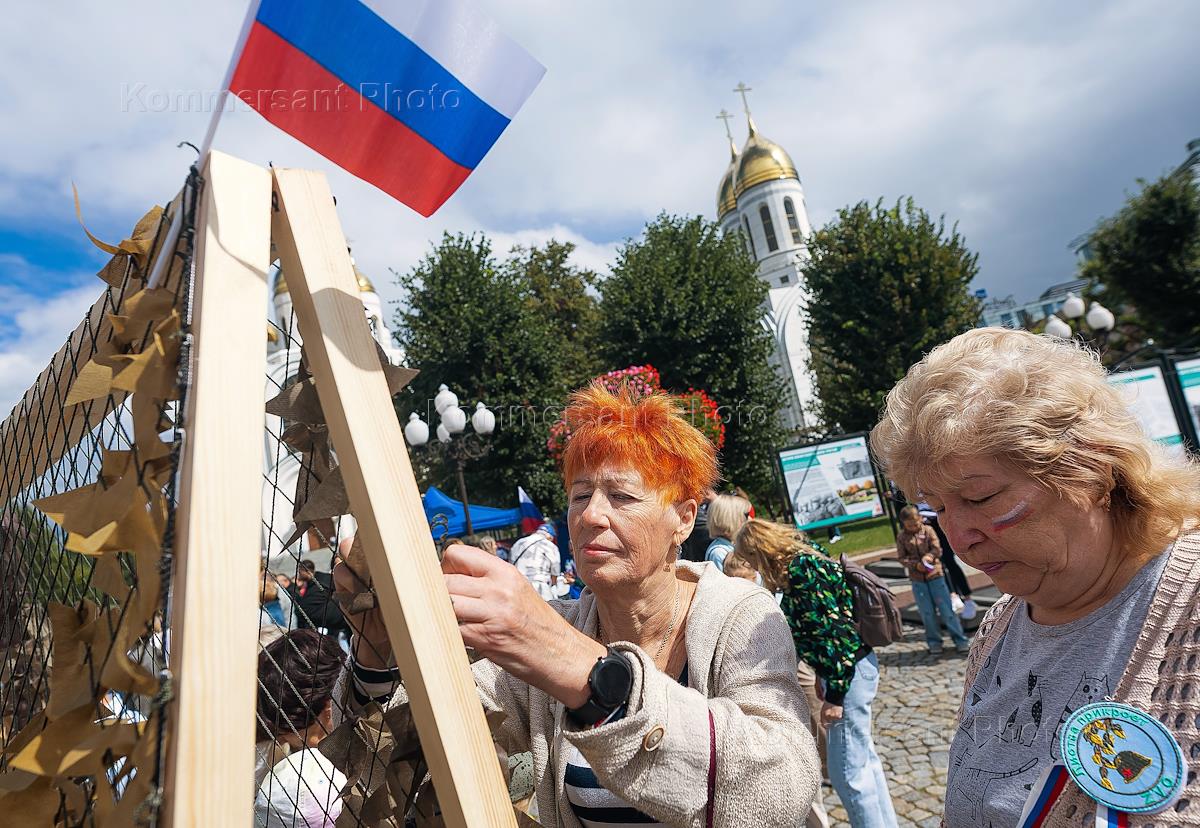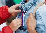 Празднование Дня Государственного флага России на площади Победы в Калининграде. Жанровая фотография. Ленточка-триколор.