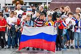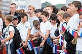 Празднование Дня Государственного флага России на площади Победы в Калининграде. Дети с флагом России на площади.