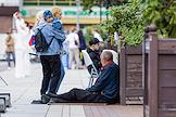 Празднование Дня Государственного флага России на площади Победы в Калининграде. Жанровая фотография. Пожилой мужчина просит милостыню на городской улице.