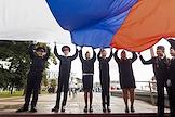 Празднование Дня Государственного флага России на площади Победы в Калининграде. Кадеты перед началом шествия с развернутым полотнищем флага России.