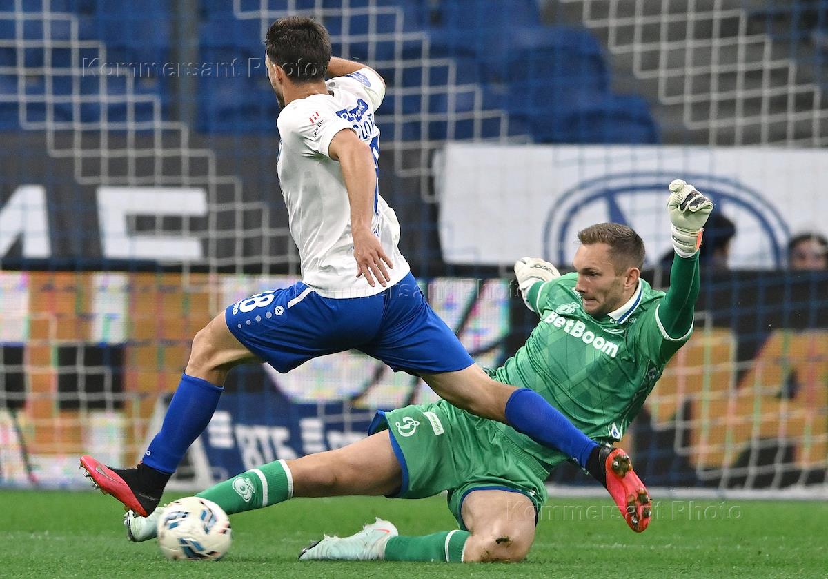 Мир Российская Премьер-Лига (РПЛ) 2025/2026. 6-й тур. Матч между командами "Динамо" (Москва) - "Пари Нижний Новгород" (Нижний Новгород) на стадионе "ВТБ Арена". Вратарь команды "Динамо" Игорь Лещук (справа) во время матча.