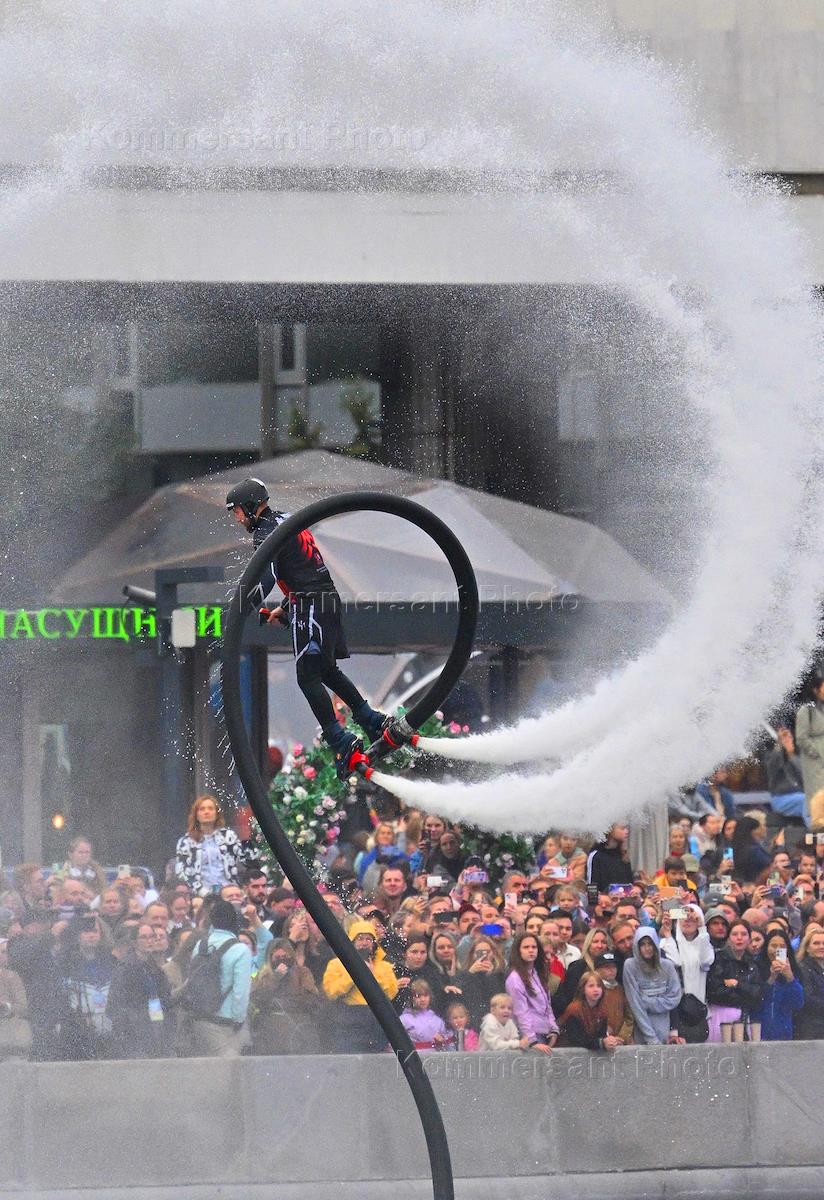 Спортивно-развлекательный фестиваль "ЛетФест" на Крымской набережной. Участники водного шоу во время выступления на флайбордах.