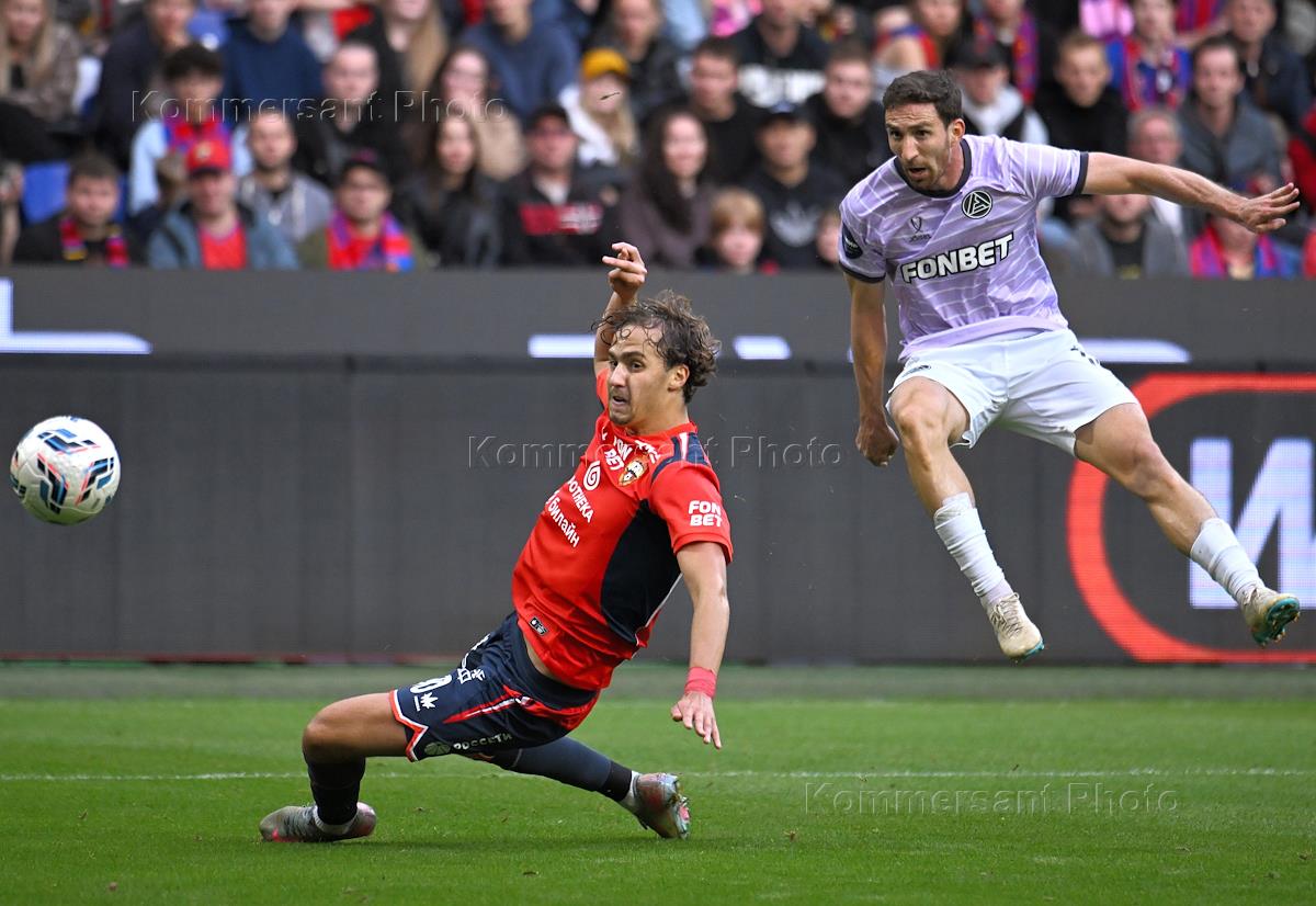 Мир Российская Премьер-Лига (РПЛ) 2025/2026. 6-й тур. Матч между командами ЦСКА (Москва) - "Акрон" (Тольятти) на стадионе "ВЭБ Арена". Игрок команды ЦСКА Игорь Дивеев (в центре) и игрок команды "Акрон" Артем Дзюба (справа) во время матча.