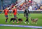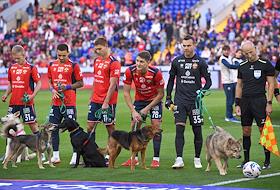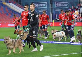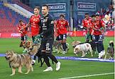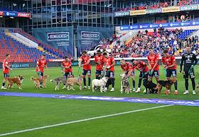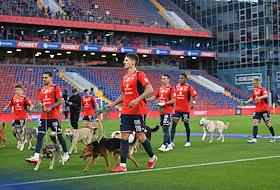 Мир Российская Премьер-Лига (РПЛ) 2025/2026. 6-й тур. Матч между командами ЦСКА (Москва) - "Акрон" (Тольятти) на стадионе "ВЭБ Арена". Игроки команды ЦСКА перед началом матча с собаками из приюта в рамках благотворительной акции фонда "Ника".