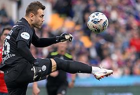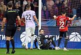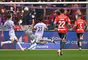 Мир Российская Премьер-Лига (РПЛ) 2025/2026. 6-й тур. Матч между командами ЦСКА (Москва) - "Акрон" (Тольятти) на стадионе "ВЭБ Арена". Вратарь команды "Акрон" Виталий Гудиев (в центре) во время матча.