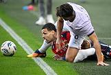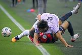 Мир Российская Премьер-Лига (РПЛ) 2025/2026. 6-й тур. Матч между командами ЦСКА (Москва) - "Акрон" (Тольятти) на стадионе "ВЭБ Арена". Игрок команды ЦСКА Матеус Алвес (слева) и игрок команды "Акрон" Константин Марадишвили (справа) во время матча.