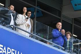 Мир Российская Премьер-Лига (РПЛ) 2025/2026. 6-й тур. Матч между командами ЦСКА (Москва) - "Акрон" (Тольятти) на стадионе "ВЭБ Арена". Артист Михаил Грушевский (второй справа) на трибуне болельщиков на стадионе во время матча.