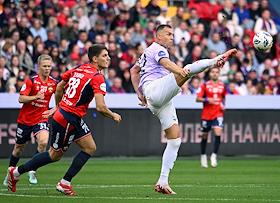 Мир Российская Премьер-Лига (РПЛ) 2025/2026. 6-й тур. Матч между командами ЦСКА (Москва) - "Акрон" (Тольятти) на стадионе "ВЭБ Арена". Игрок команды "Акрон" Максим Кузьмин во время матча.