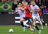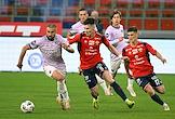 Мир Российская Премьер-Лига (РПЛ) 2025/2026. 6-й тур. Матч между командами ЦСКА (Москва) - "Акрон" (Тольятти) на стадионе "ВЭБ Арена". Игроки команды "Акрон" Ифет Джаковац (слева), Константин Марадишвили (справа) и игрок команды ЦСКА Тамерлан Мусаев (в центре) во время матча.