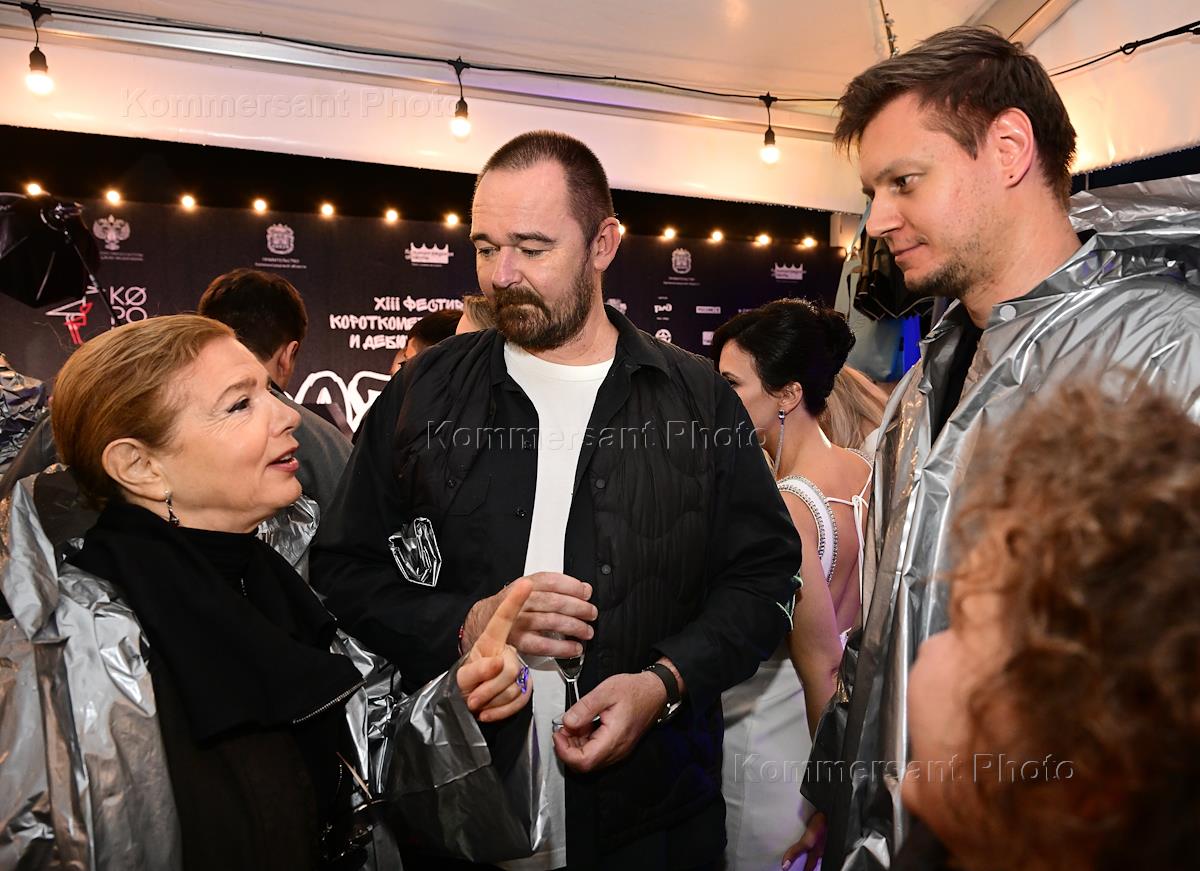 XIII Ежегодный российский кинофестиваль короткометражного и дебютного кино "Короче". Церемония закрытия в Центральном парке. Слева направо: актер Гоша Куценко, продюсер Жанна Бекмамбетова и актер Роман Евдокимов на церемонии.