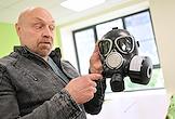 День открытых дверей в общеобразовательной школе ГБОУ "Марьинская школа № 1566 памяти Героев Сталинградской битвы". Жанровая фотография. Кабинет предмета "Основы безопасности и защиты родины (ОБЗР)". Учитель ОБЗР, подполковник в отставке Алексей Стельмах во время демонстрации противогаза.