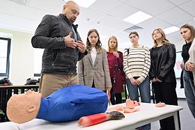 День открытых дверей в общеобразовательной школе ГБОУ "Марьинская школа № 1566 памяти Героев Сталинградской битвы". Жанровая фотография. Кабинет предмета "Основы безопасности и защиты родины (ОБЗР)". Учитель ОБЗР, подполковник в отставке Алексей Стельмах во время демонстрации оказания первой медицинской помощи на манекене.