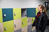 День открытых дверей в общеобразовательной школе ГБОУ "Марьинская школа № 1566 памяти Героев Сталинградской битвы". Жанровая фотография. Личные шкафчики учеников в коридоре школы.