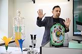 День открытых дверей в общеобразовательной школе ГБОУ "Марьинская школа № 1566 памяти Героев Сталинградской битвы". Жанровая фотография. Кабинет биологии. Учитель биологии Анатолий Гордиев в кабинете.