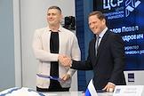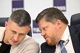 Пресс-конференция, посвященная развитию автомобильного туризма в стране, и презентация карты и логотипа туристических автомаршрутов в пресс-центре ТАСС. Генеральный директор Фонда "Центр стратегических разработок" (ЦСР) Павел Смелов (слева) и заместитель министра экономического развития России Дмитрий Вахруков (справа) перед началом пресс-конференции.
