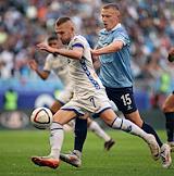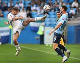 Фонбет - Кубок России по футболу 2024/25. 3-й Тур. Матч между командами "Крылья Советов" (Самара) - "Динамо" (Москва) на стадионе "Солидарность Самара Арена". Игрок команды "Динамо" Антон Миранчук (справа) и игрок команды "Крылья Советов" Николай Рассказов (слева) во время матча.