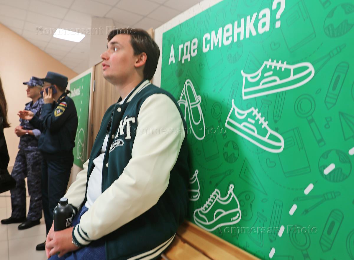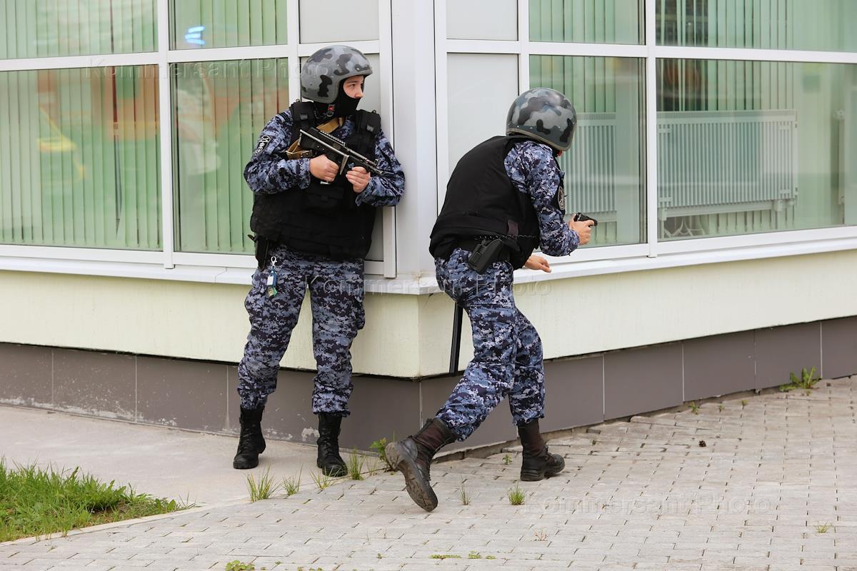 Тренировка по обеспечению безопасности на избирательных участках с участием представителей МВД, МЧС, Росгвардии и членов избирательных комиссий Свердловской области в МАОУ СОШ № 33. Сотрудники полиции во время тренировки.