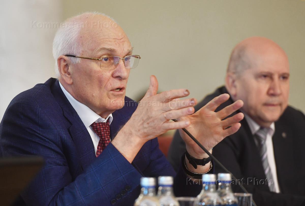 Совещание, посвящённое обсуждению промежуточных итогов и перспектив реализации пилотного проекта совершенствования системы высшего образования и подготовки кадров для российской экономики, в Санкт-Петербургском горном университете императрицы Екатерины II. Ректор Санкт-Петербургского государственного горного института, академик Российской академии естественных наук (РАЕН) Владимир Литвиненко (слева) во время совещания.