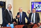 Совещание, посвящённое обсуждению промежуточных итогов и перспектив реализации пилотного проекта совершенствования системы высшего образования и подготовки кадров для российской экономики, в Санкт-Петербургском горном университете императрицы Екатерины II. Слева направо: вице-губернатор Санкт-Петербурга по образованию и науке Владимир Княгинин, генеральный директор Национального федерального медицинского исследовательского центра имени В. А. Алмазова, президент Российского кардиологического общества, главный кардиолог Санкт-Петербурга и Северо-Западного федерального округа Евгений Шляхто и ректор Санкт-Петербургского политехнического университета Петра Великого Андрей Рудской во время совещания.