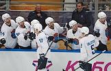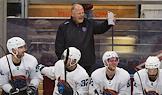 Кубок мэра Москвы по хоккею. Матч между командами "Спартак" (Москва) и "Шанхай Дрэгонс" (Санкт-Петербург) на стадионе "Мегаспорт". Главный тренер команды "Шанхай Дрэгонс" Жерар Галлан (в центре) во время матча.