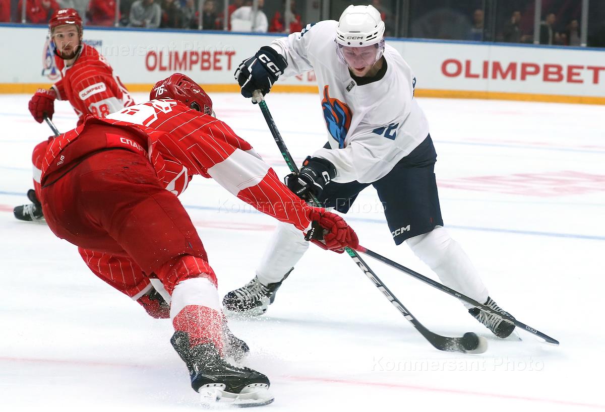 Кубок мэра Москвы по хоккею. Матч между командами "Спартак" (Москва) и "Шанхай Дрэгонс" (Санкт-Петербург) на стадионе "Мегаспорт". Игрок команды "Спартак" Даниил Орлов (справа) во время матча.