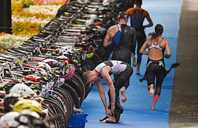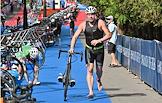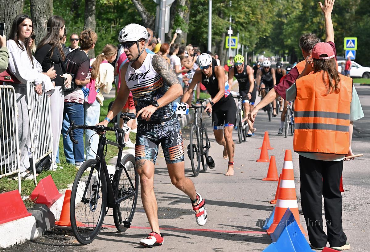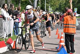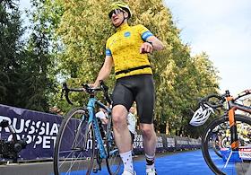 Чемпионат Московской области по триатлону. Первенство среди любителей. XII Дубненский триатлон "Николов Перевоз". Участник чемпионата Дмитрий Сергеев (слева) во время соревнований.