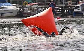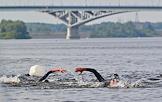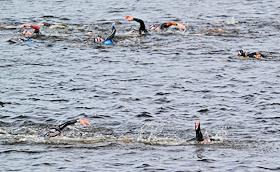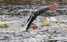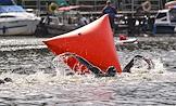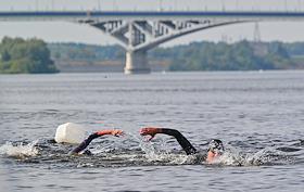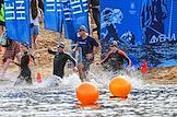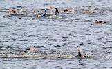 Чемпионат Московской области по триатлону. Первенство среди любителей. XII Дубненский триатлон "Николов Перевоз". Участники чемпионата во время заплыва на реке.