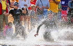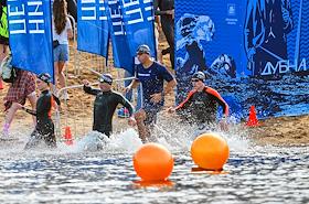 Чемпионат Московской области по триатлону. Первенство среди любителей. XII Дубненский триатлон "Николов Перевоз". Участники чемпионата на финише заплыва.