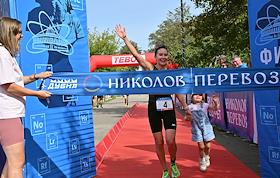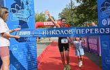 Чемпионат Московской области по триатлону. Первенство среди любителей. XII Дубненский триатлон "Николов Перевоз". Участница Елена Полянская, победившая в чемпионате, на финише забега.