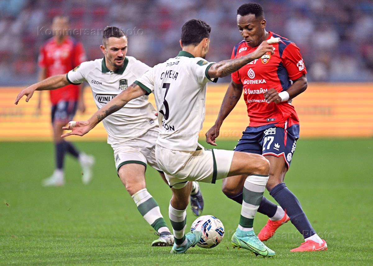 Мир Российская Премьер-Лига (РПЛ) 2025/2026. 7-й тур. Матч между командами ЦСКА (Москва) - "Краснодар" (Краснодар) на стадионе "ВЭБ Арена". Слева направо: игрок команды "Краснодар" Сергей Петров, игрок команды ЦСКА Мойзес игрок команды "Краснодар" Дуглас Аугусто во время матча.