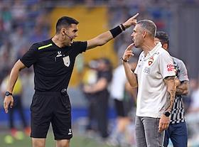 Мир Российская Премьер-Лига (РПЛ) 2025/2026. 7-й тур. Матч между командами ЦСКА (Москва) - "Краснодар" (Краснодар) на стадионе "ВЭБ Арена". Главный судья Рафаэль Шафеев (слева) и главный тренер команды ЦСКА Фабио Челестини (справа) во время матча.