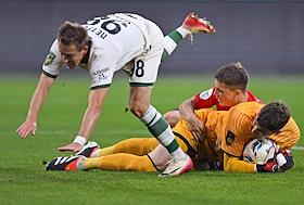 Мир Российская Премьер-Лига (РПЛ) 2025/2026. 7-й тур. Матч между командами ЦСКА (Москва) - "Краснодар" (Краснодар) на стадионе "ВЭБ Арена". Игроки команды "Краснодар" Сергей Петров (слева) и вратарь Станислав Агкацев (справа) во время матча.