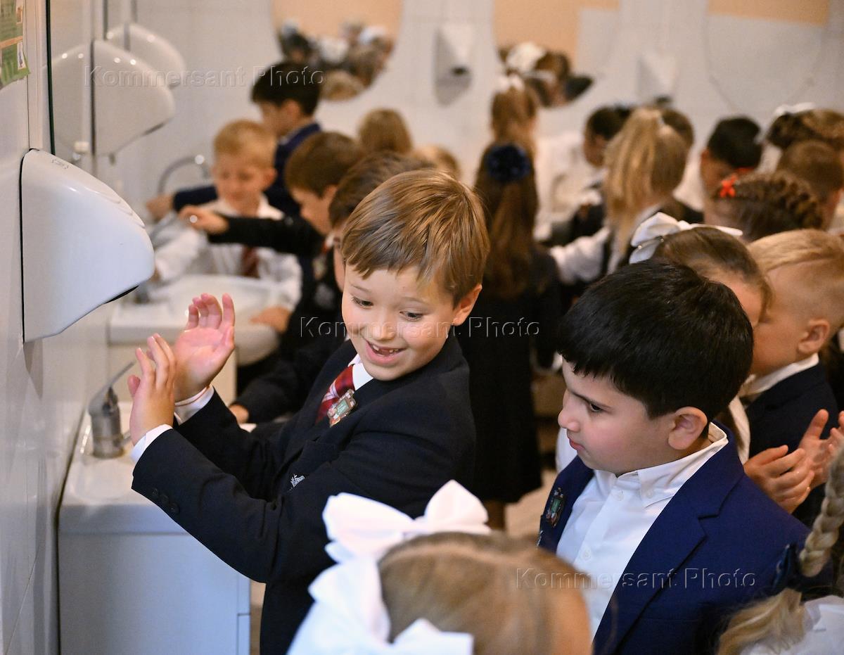 День знаний в московской школе № 1409. Учащиеся первого класса в столовой.