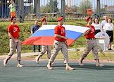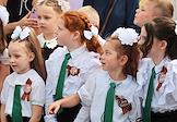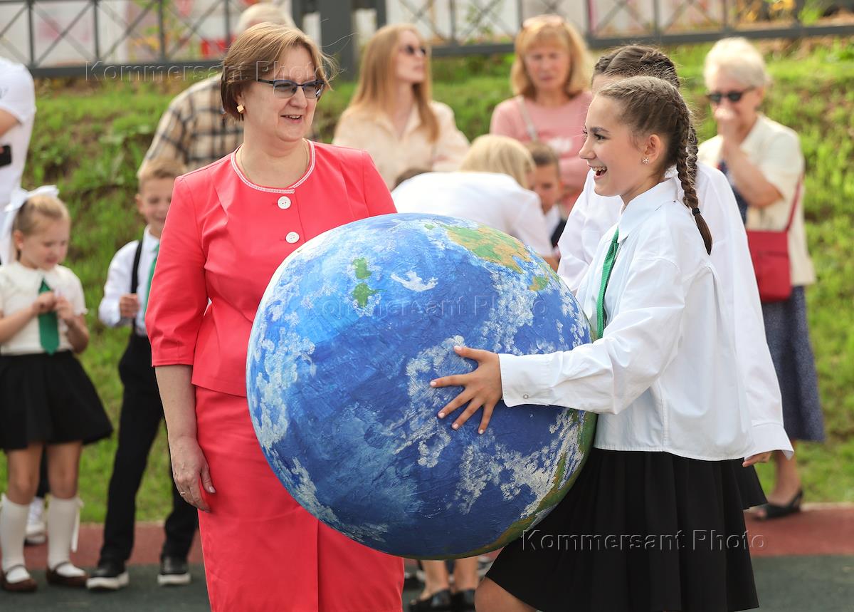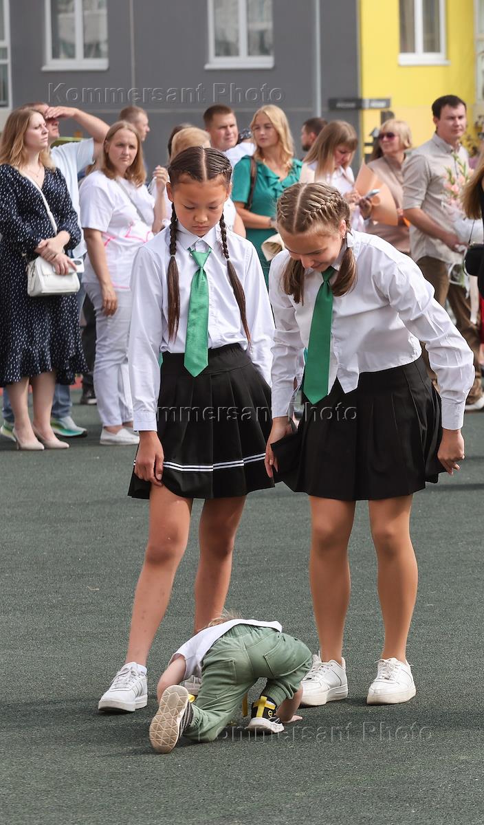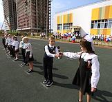 Празднование Дня знаний в Анкудиновской средней школе в жилом комплексе "Анкудиновский парк". Ученики во время торжественной линейки, посвященной началу учебного года.