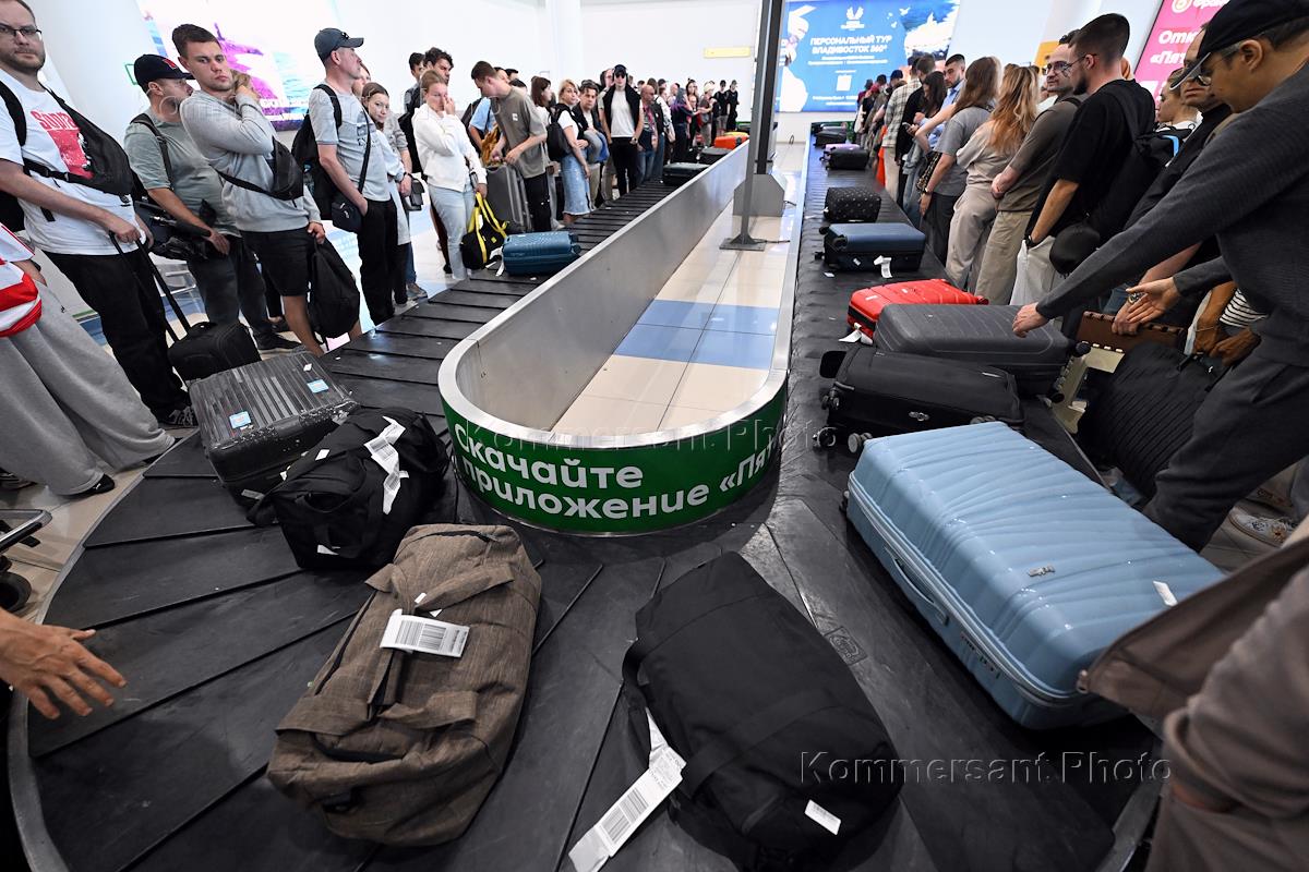 Восточный экономический форум (ВЭФ) 2025 на территории Дальневосточного федерального университета (ДВФУ) на острове Русский. Жанровая фотография. Участники во время прибытия в Международный аэропорт Владивостока имени В. К. Арсеньева.