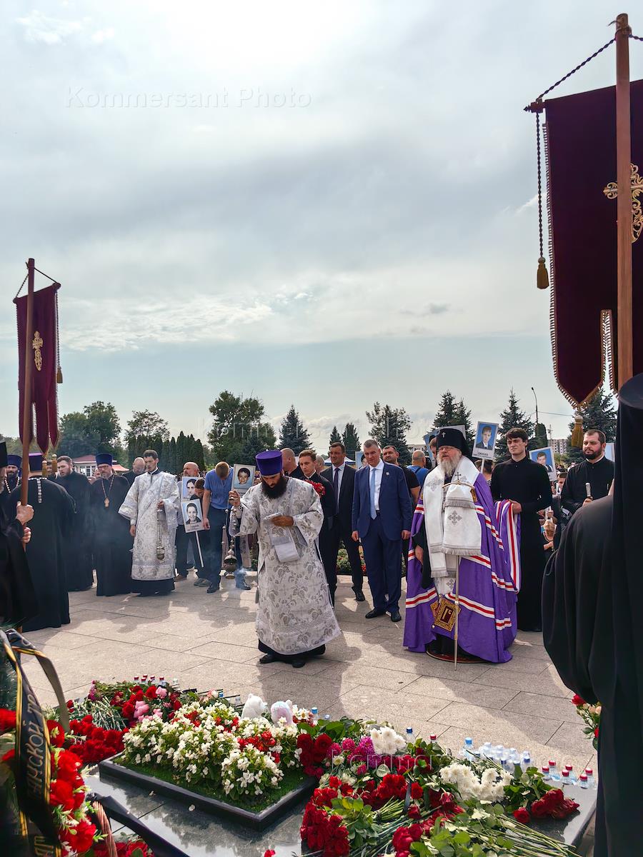 Mourning events dedicated to the 21st anniversary of the terrorist attack on Secondary School No. 1 in Beslan. Clergy during the mourning events at the City of Angels memorial cemetery.