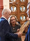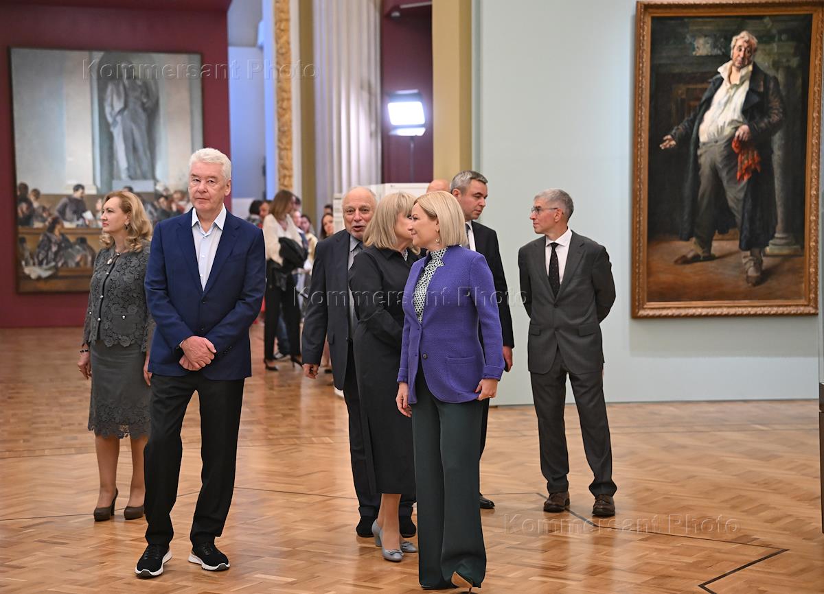 Пресс-показ экспозиции "Образ Москвы в русском искусстве из коллекции Государственного Русского музея" в павильоне № 1 "Центральный" на ВДНХ. Председатель Наблюдательного Совета Фонда содействия возрождению традиций милосердия и благотворительности "Елисаветинско-Сергиевское просветительское общество" Анна Громова (справа) и мэр Москвы Сергей Собянин (слева) на пресс-показе.