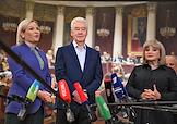 Пресс-показ экспозиции "Образ Москвы в русском искусстве из коллекции Государственного Русского музея" в павильоне № 1 "Центральный" на ВДНХ. Слева направо: министр культуры России Ольга Любимова, мэр Москвы Сергей Собянин и генеральный директор Государственного Русского музея Алла Манилова на пресс-показе.