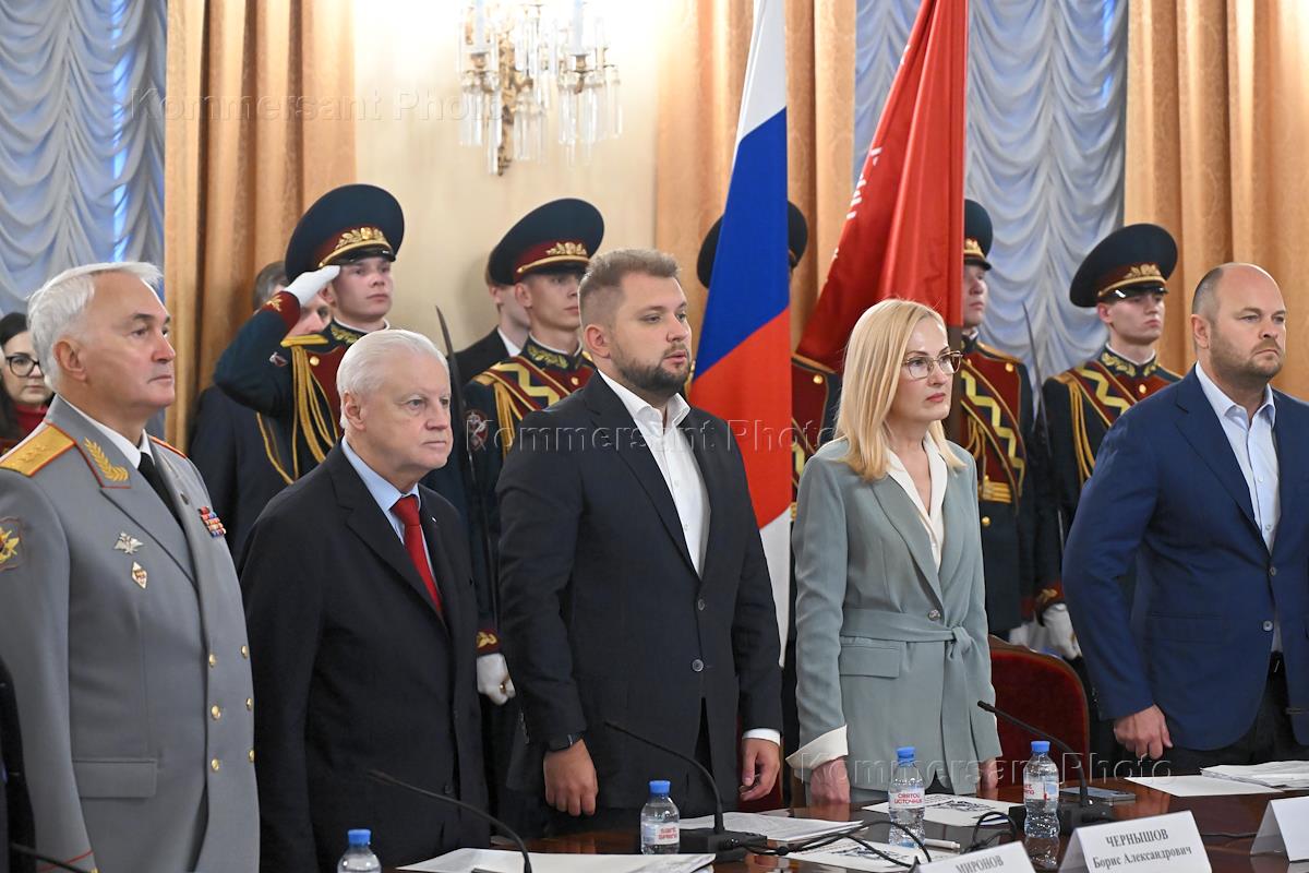 Международный антифашистский форум-2025, приуроченный к 80-летию победы в Великой Отечественной войне 1941-1945 годов и Международному дню памяти жертв фашизма, в Государственной думе (ГД) России. Слева направо: председатель Совета по патриотическому воспитанию Общероссийской организации "Офицеры России" Александр Головашкин, руководитель Центрального исполкома Общероссийской организации "Офицеры России", ветеран ФСБ Александр Михайлов, председатель комитета ГД России по обороне Андрей Картаполов, председатель партии "Справедливая Россия – За Правду", руководитель фракции "Справедливая Россия – За Правду" в ГД России Сергей Миронов и заместитель председателя ГД России Борис Чернышов во время пленарного заседания форума.