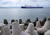 Виды Калининградской области. Жанровая фотография. Бетонные тетраподы вдоль берега Балтийского моря в районе города Балтийска. Паром "Амбал".