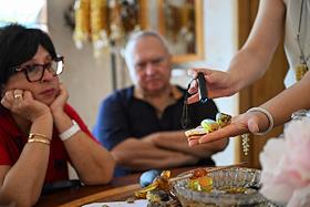 Жанровая фотография. Женщина светит фонариком на янтарь.