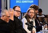 Пресс-конференция, посвященная открытию 107 сезона Московского академического Музыкального театра им. К.С. Станиславского и Вл. И. Немировича-Данченко (МАМТ), на Основной сцене театра. Главный режиссер МАМТ Александр Титель (слева) во время пресс-конференции.