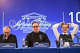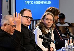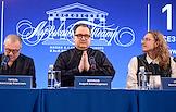 Пресс-конференция, посвященная открытию 107 сезона Московского академического Музыкального театра им. К.С. Станиславского и Вл. И. Немировича-Данченко (МАМТ), на Основной сцене театра. Слева направо: главный режиссер МАМТ Александр Титель, генеральный директор МАМТ Андрей Борисов и художественный руководитель балетной труппы МАМТ Максим Севагин во время пресс-конференции.