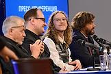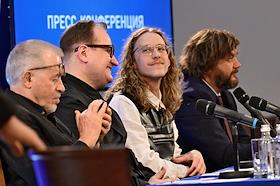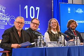 Пресс-конференция, посвященная открытию 107 сезона Московского академического Музыкального театра им. К.С. Станиславского и Вл. И. Немировича-Данченко (МАМТ), на Основной сцене театра. Слева направо: главный режиссер МАМТ Александр Титель, генеральный директор МАМТ Андрей Борисов, художественный руководитель балетной труппы МАМТ Максим Севагин и главный дирижер МАМТ Феликс Коробов во время пресс-конференции.