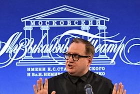 Пресс-конференция, посвященная открытию 107 сезона Московского академического Музыкального театра им. К.С. Станиславского и Вл. И. Немировича-Данченко (МАМТ), на Основной сцене театра. Главный дирижер МАМТ Феликс Коробов во время пресс-конференции.